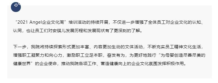 我院常务副院长张红女士也在总结中强调:企业文化周活动的连续举办,其重要意义就是贯彻安琪儿价值观、传承安琪儿精神,促进不同部门、不同岗位的员工相互了解,换位思考。在优秀企业文化的熏陶下,加强员工归属感、培养员工主人翁意识,以企为家,荣辱与共。